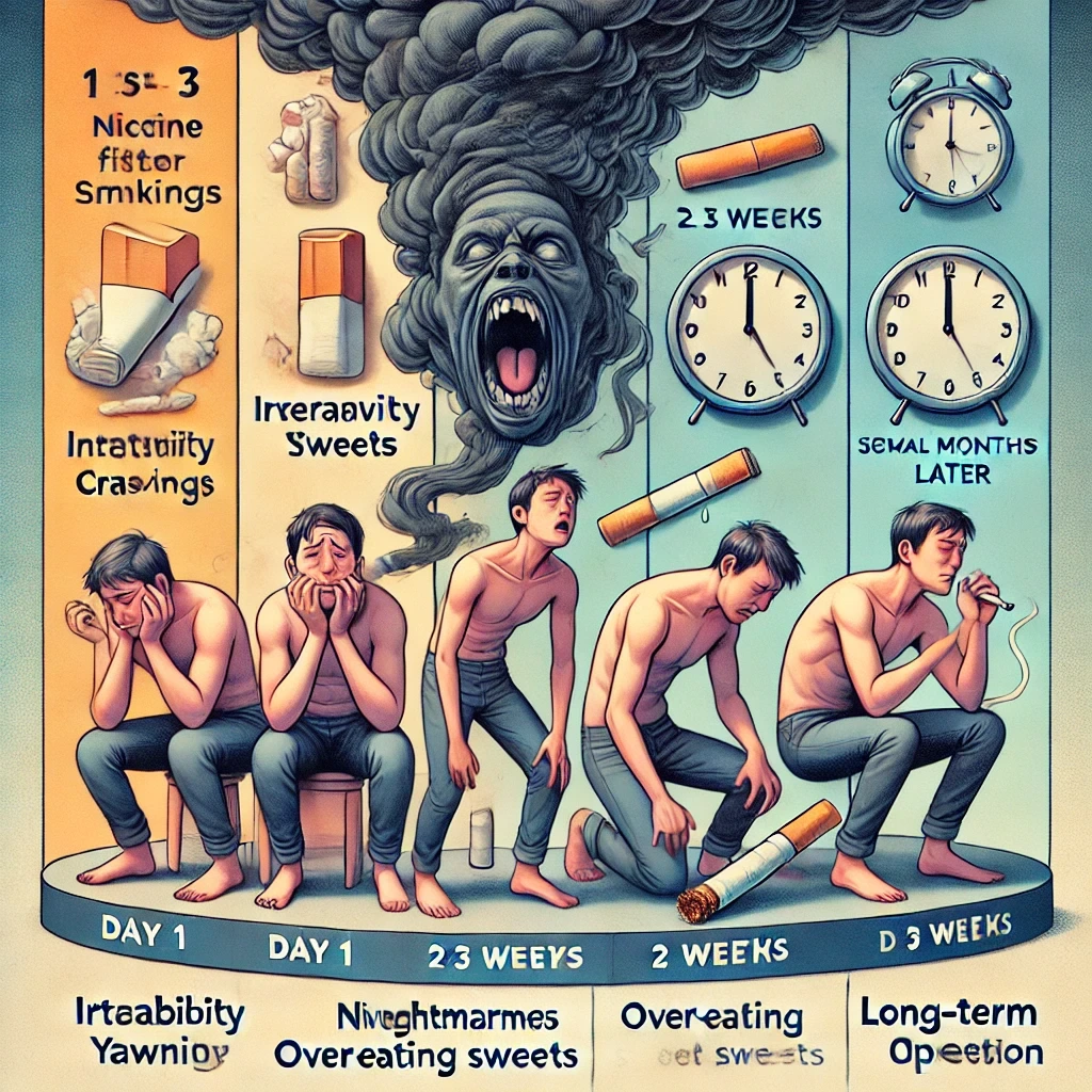금단증세는 신체적·정신적인 반응입니다. 니코틴은 강한 중독성을 가진 물질이라, 갑자기 끊게 되면 뇌와 몸이 그 부재에 민감하게 반응하게 됩니다. 아래는 주요 금단 증세와 그 설명입니다:
