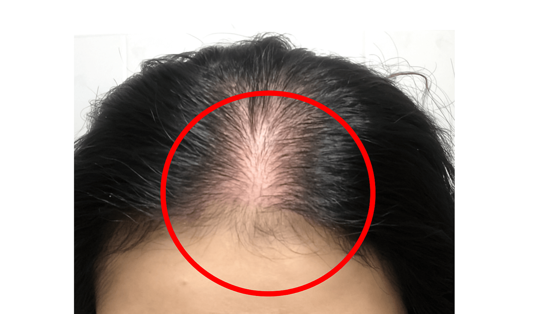 정수리 가르마를 중심으로 전체적으로 가늘어지고 숱이 줄며 두피가 드러나는 양상을 보입니다.