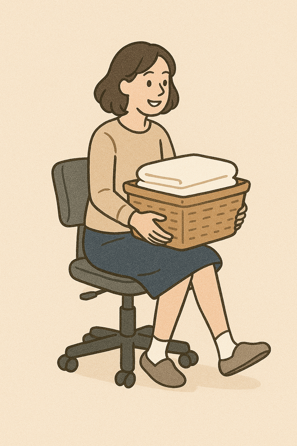 - 앉아서 작업: 채소 다듬기, 요리, 옷 개기, 식기 정리 등 가능한 집안들은 가능하면 식탁이나 테이블에 앉아서 처리하세요.