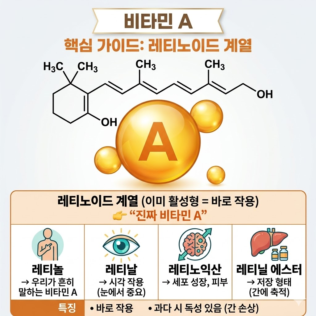 - 레티닐 에스터 (Retinyl ester) → 저장 형태 (간에 축적)