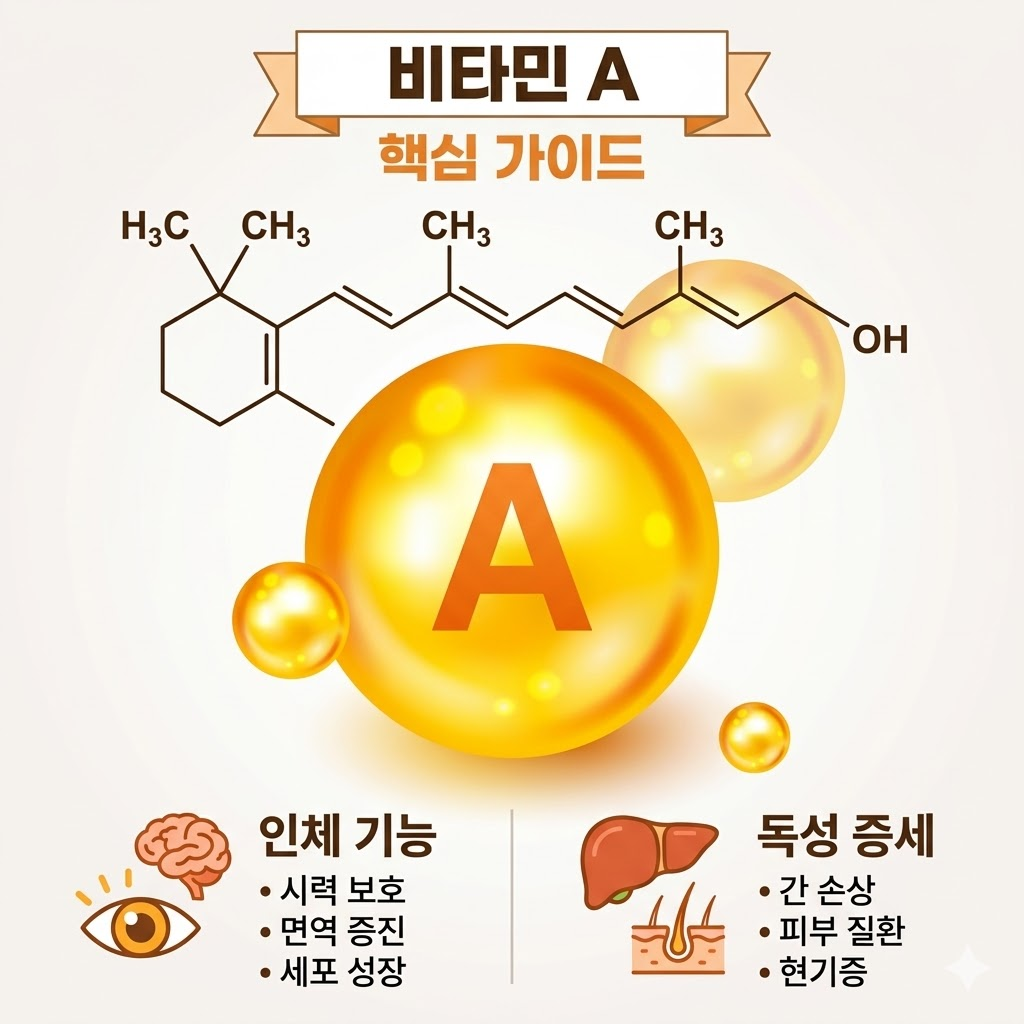 반면에 비타민 A는 활성 형태인 레티놀과 체내에서 전환되는 베타카로틴 등 급원 형태가 다양해, 여러 영양제를 병용할 경우 성분 함량을 직관적으로 합산하기 어려워 중복 섭취의 위험이 큽니다. 그러므로 내가 섭취하는 비타민이나 건강기능식품들에서 비타민 A의 여러가지 친척 물질들을 합산해보는 것은 독성의 발현을 막기 위해서 필요할 수 있습니다.
