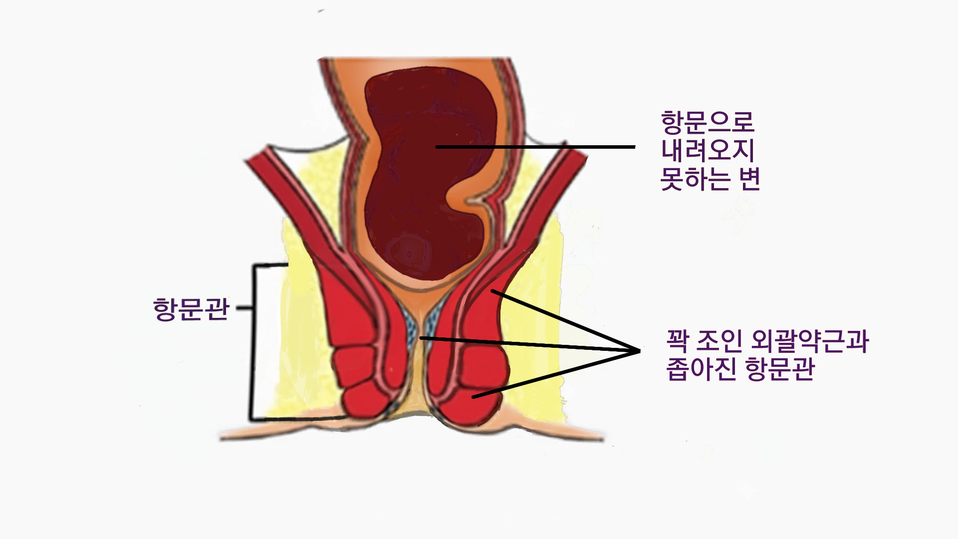 위기의 시작은 변이 내괄약근을 통과하여 길이가 약 2.5cm에서 5cm에 달하는 항문관으로 진입하면서 부터 시작합니다. 일단 변이 항문에 진입하여 깊숙이 내려오고, 특히 중간 정도 이상 지나서 마지막 항문 출구 근처에 와 있다면 이제는 외괄약근을 아무리 강하게 조여도 그 압력을 오래 막아내지 못하고 대변은 결국 밀고 나옵니다. 따라서, 변이 항문관 자체에 진입을 전혀 못하고 직장에만 머무르도록 유지시키는 것이 절박한 배변 욕구를 늦추는 가장 핵심적인 방법이라 할 수 있습니다.