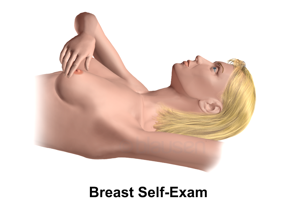 - 방법: 편안하게 누워 검진하려는 쪽의 팔을 머리 위로 올립니다. 반대쪽 손의 손가락 2~3마디의 지문 부위를 이용하여 유방 전체를 꼼꼼히 만져봅니다. 단, 유방 조직을 꼬집듯이 집어올려서 만져보면 안됩니다. 이렇게 하면 얇게 퍼진 유방의 유선 조직이 겹쳐져서 만져지게 되어 덩어리 같고, 종양으로 오인할 수 있습니다. 단지 손가락의 끝 부위를 이용해서 조직을 꼼꼼이 여러 부분을 나누어서 눌러보거나, 이리 저리 문지르면서 돌출된 것을 찾아보는 것입니다.