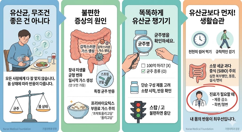결론은 유산균이 나쁜 게 아니라, 나와 안 맞는 유산균이 있을 수 있다는 것. 어떤 사람에게는 도움이 되지만, 어떤 사람에게는 가스와 팽만감을 키울 수도 있습니다. 장 건강은 유행이나 광고 카피가 아니라, 내 몸의 반응으로 판단해야 합니다. “좋다니까 계속 먹어야지”보다 “내 몸이 편한가?”를 먼저 묻는 것이 진짜 건강관리다