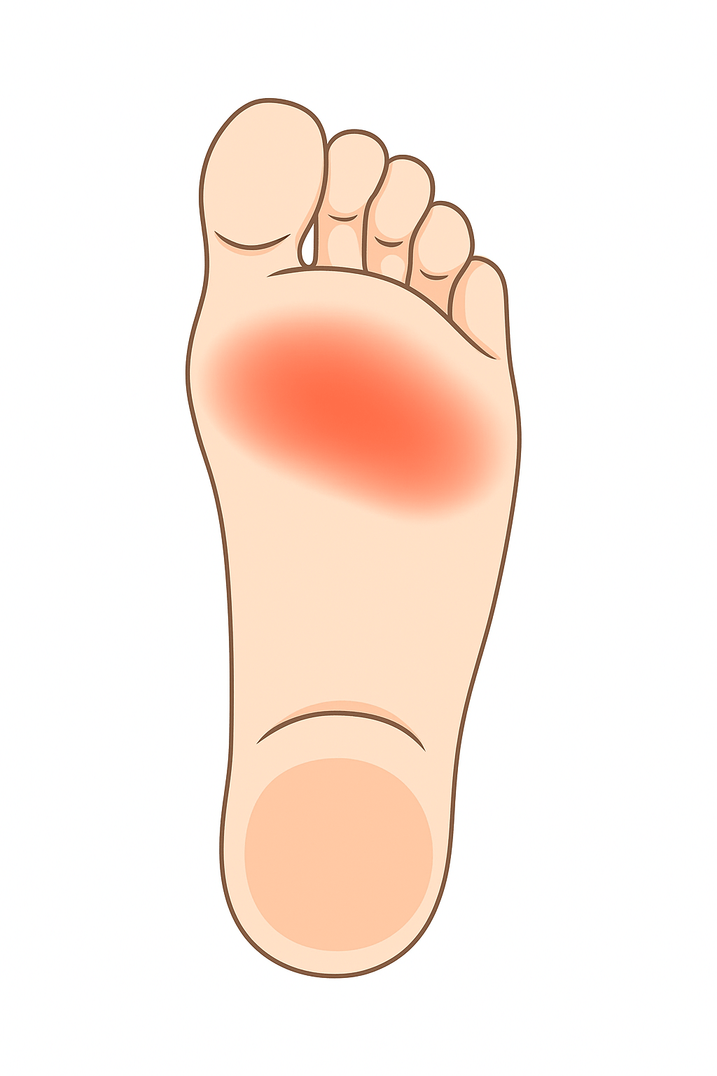 중족골통증은 제2~4 중족골의 두부 부위(발가락과 연결되는 부위)에 과도한 압력이 반복적으로 가해지며, 그 하부 연부조직이 염증과 통증을 일으키는 상태입니다.