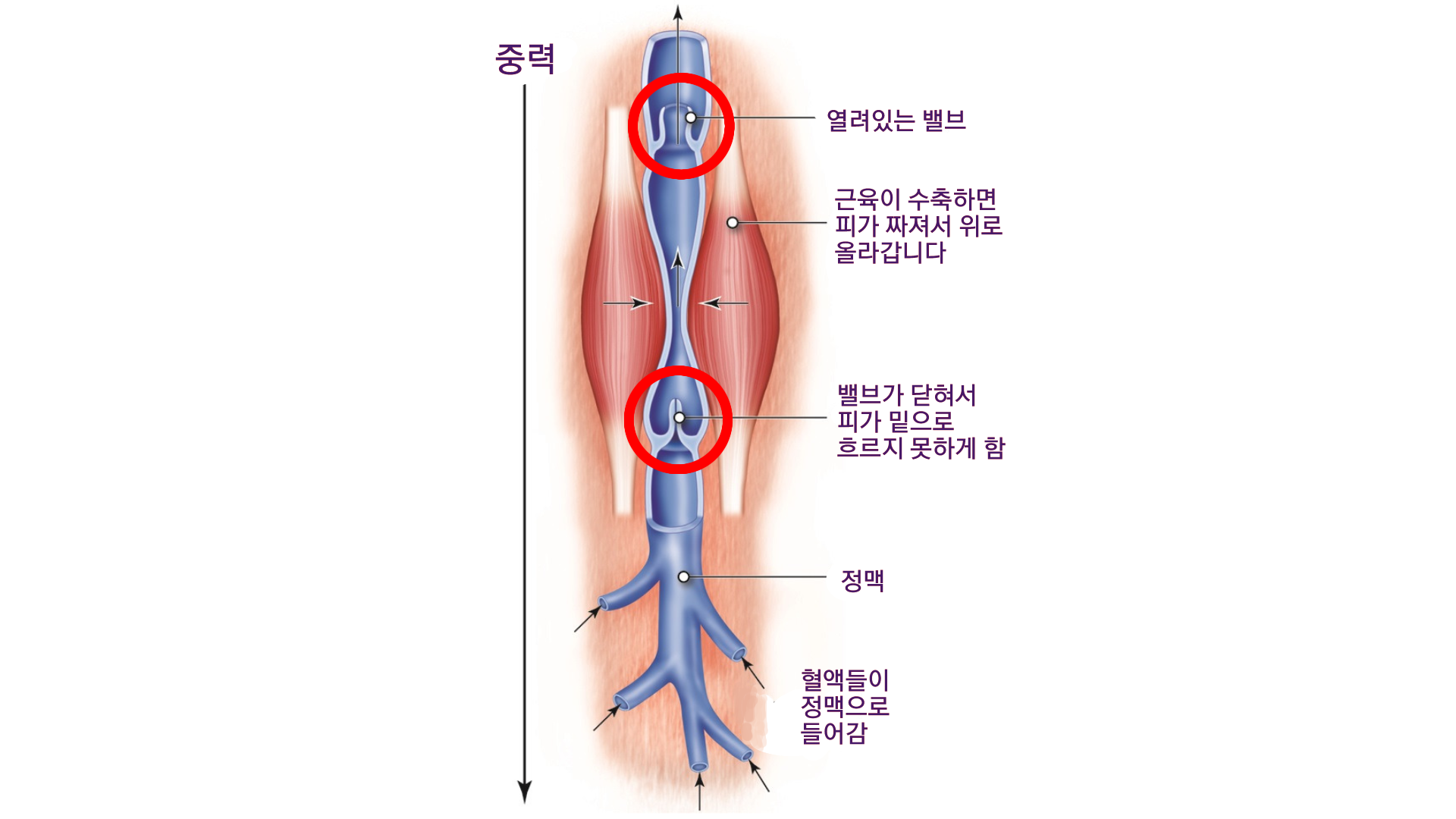 정맥은 다리에서 심장으로 혈액을 올려 보내는 역할을 하며, 이 과정에서 '정맥 밸브(판막)'가 매우 중요합니다. 혈액이 조금이라도 올라오면 밸브가 닫혀서 일단 올라온 피는 다시 내려가지 않도록 잡아주고, 그 다음 근육이 수축하면 또 다음 밸브까지 올려주는 방식으로 작동합니다. 그러니까 펌프의 물을 일단 퍼 올리면 밑으로 내려가지 못하고 고여서 점차 넘쳐 나오는 것과 같은 원리입니다.